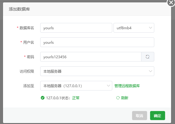安装完成后创建用户,可以通过宝塔面板添加:(数据库名 yourls,用户名 yourls,密码 yourls123456,选择本地服务器)